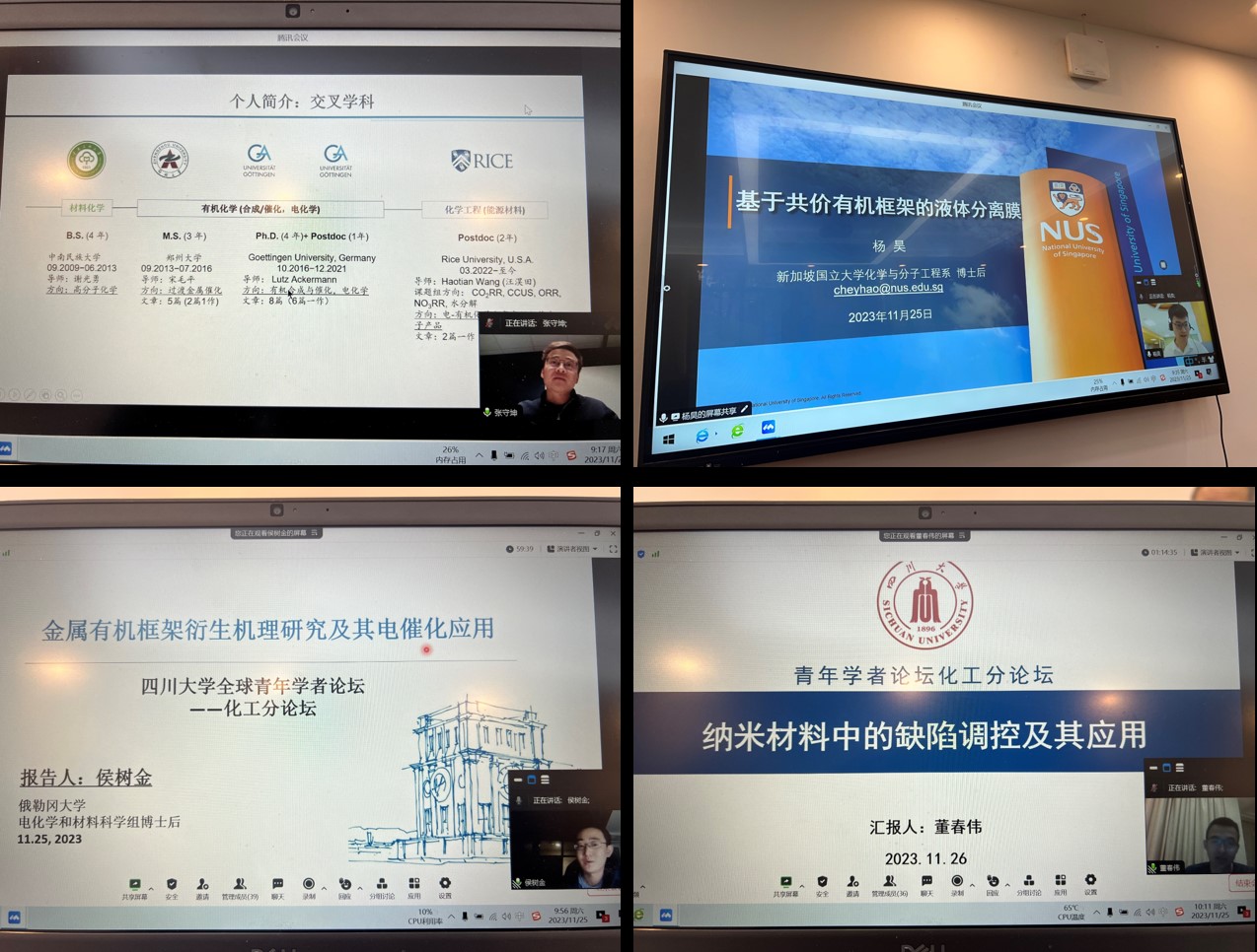 新葡亰8883ent于2023年11月25日上午9点,在望江校区化工楼235会议室,成功召开了新葡亰8883ent第十一届全球青年学者论坛——化工分论坛。来自美国莱斯大学、美国俄勒冈大学、美国佛罗里达大学、新加坡国立大学、新加坡南洋理工大学、丹麦科技大学、瑞士苏黎世联邦理工学院、阿卜杜拉国王科技大学、德国马克思普朗克煤炭研究所、清华大学等全球一流高校和科研院所的30多位优秀青年学者与我院师生相聚云端,举行了线上线下相结合的精彩学术报告分享交流会。本次论坛由我院副院长钮大文教授主持。