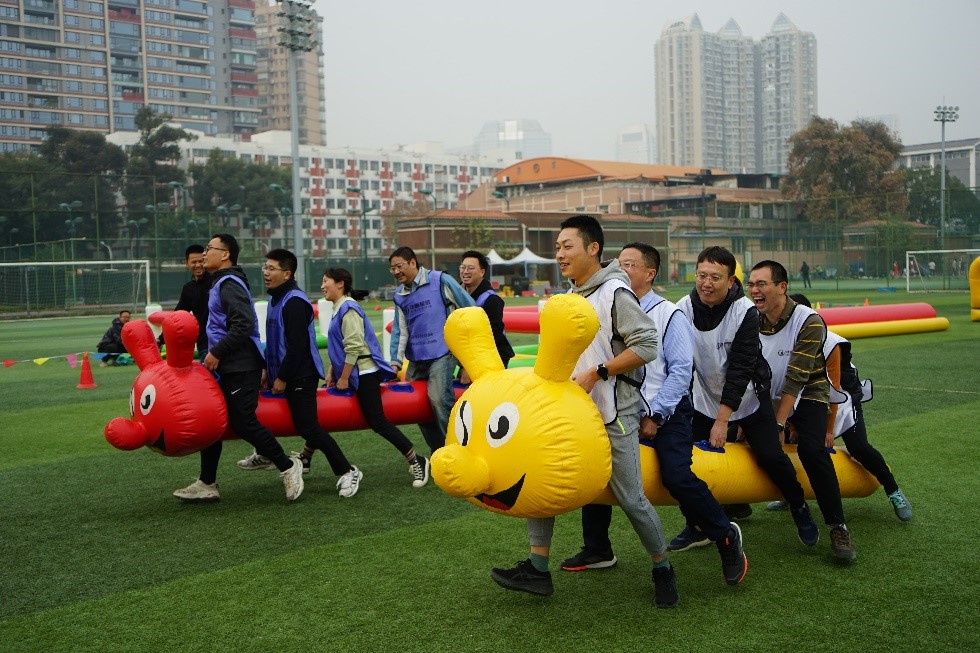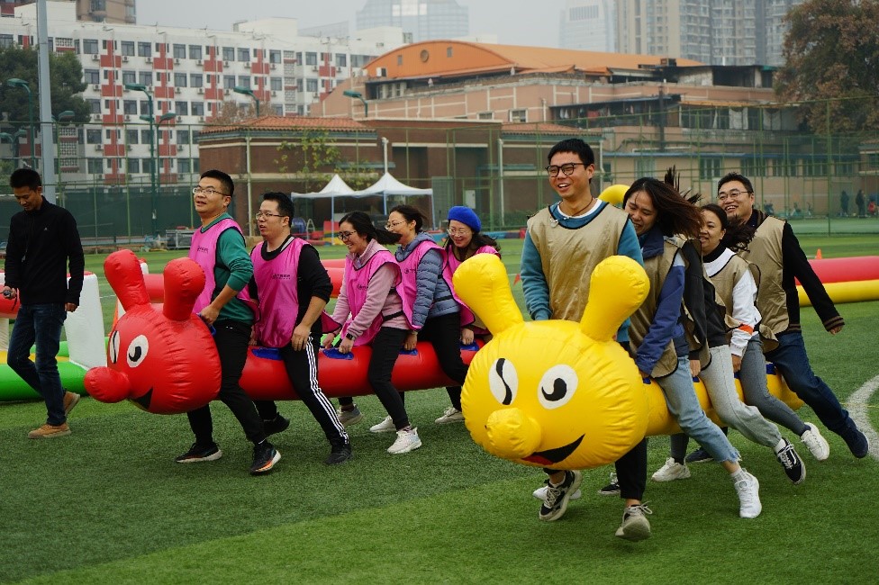 经过热身活动后,老师们通过抽签的方式随机组成4支队伍参赛。趣味毛毛虫、跨越障碍赛、飞盘游戏, 参赛队伍们充分发挥集体协作的精神,在一阵阵加油和欢呼声中拉进彼此的距离,展现化工教师的运动风采。经过三个项目总成绩的激烈角逐,最终由“To be No.1队”获得冠军,“绿色低碳队”获得第二名,“高发队”获得第三名,“20万队”获得第四名。