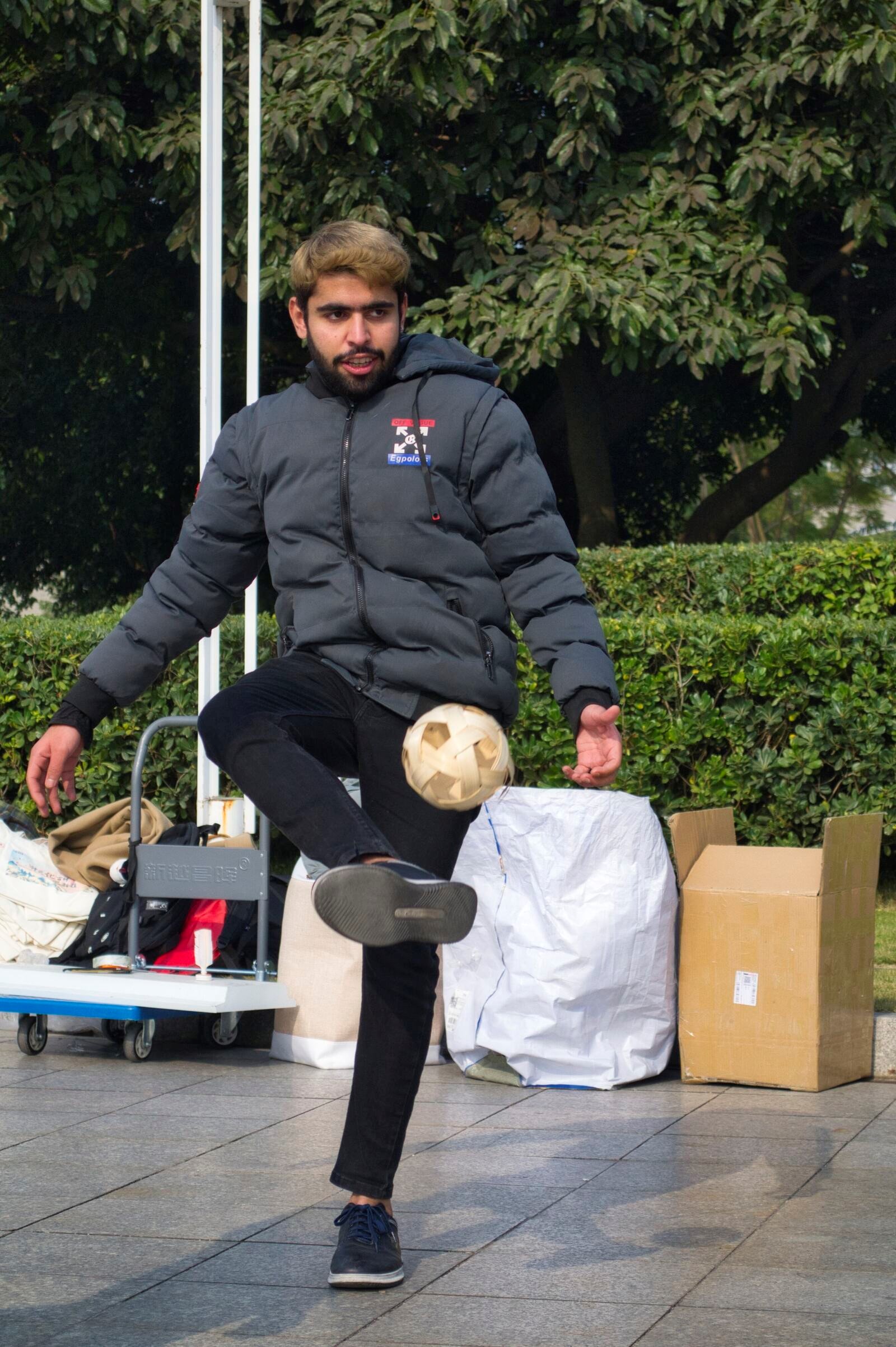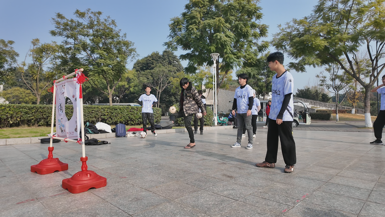 之后,拥有悠久历史的蹴鞠活动开始了。首先由留学生、港澳台学生和其他学生组成的五人小组,向各位同学展示了蹴鞠表演。随后,参与蹴鞠活动的同学们被分成三人一组,共同进行了一场蹴鞠比赛,老师、留学生、港澳台和其他学生一起将蹴鞠不断踢过立牌,同学们或用身体,或用头部,或一记大力,或轻轻踢出,各种动作不断吸引着其他同学的兴趣。