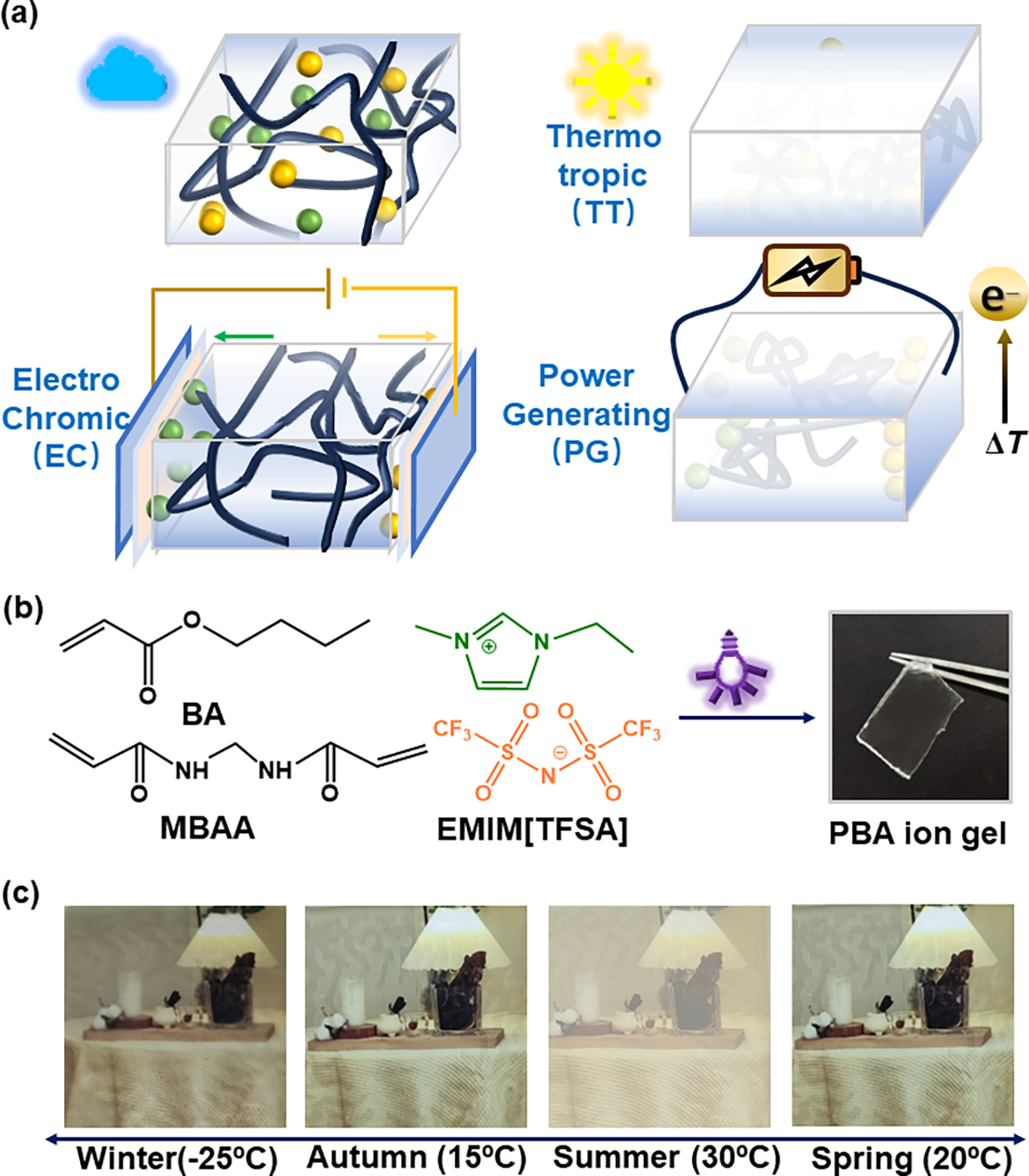 图1 通过原位紫外线聚合得到的PBA离子凝胶及具有TT、EC和PG功能的“一体化”智能窗户