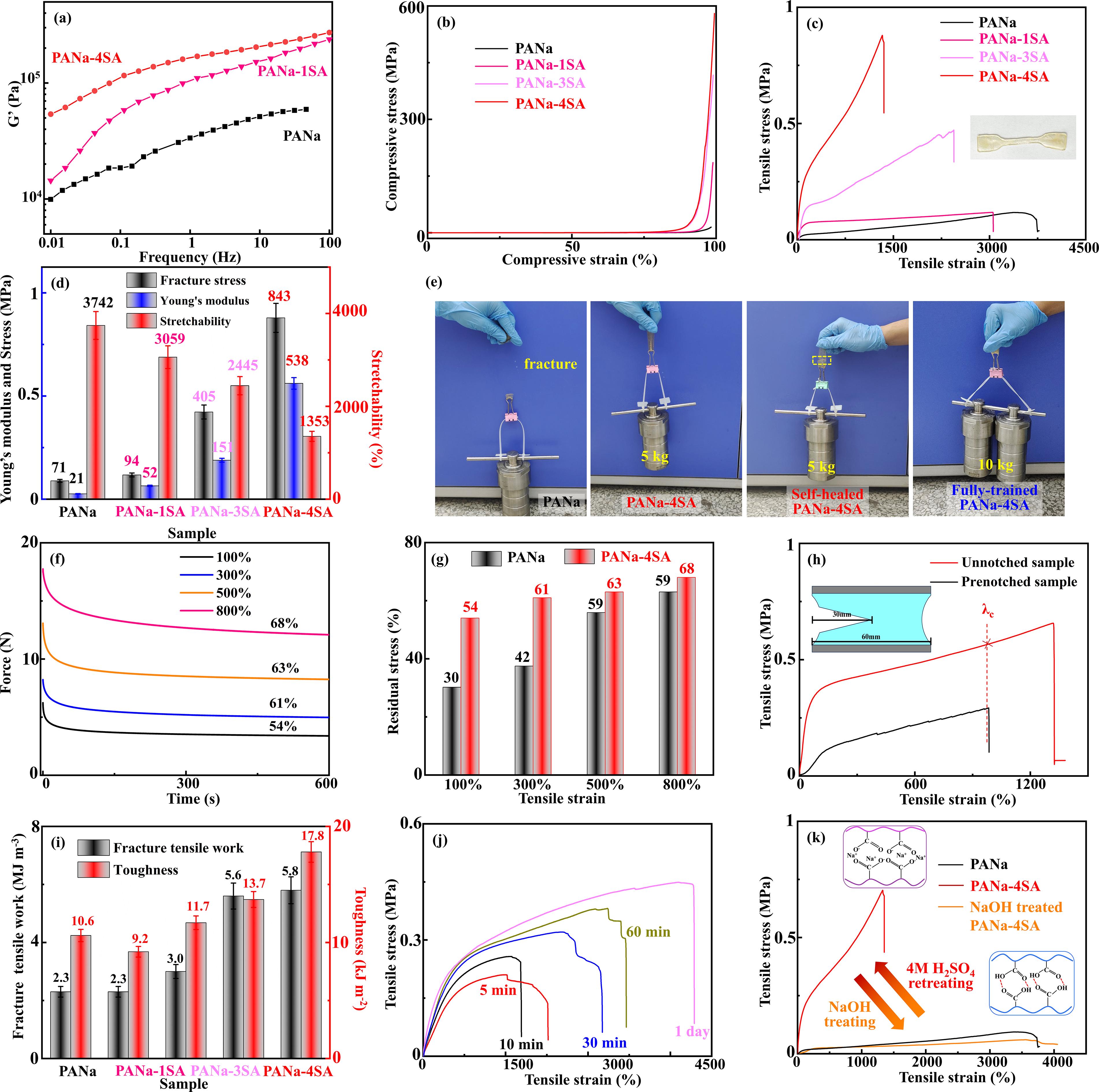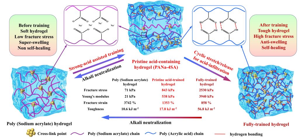 通过将丙烯酸钠水凝胶网格浸入4M浓硫酸,在丙烯酸钠聚合物网络表面构建致密的氢键,实现凝胶力学性能的强化,同时赋予凝胶网格抗溶胀性能和自修复性能。在此基础上,进一步通过循环载荷实现丙烯酸钠强酸水凝胶的力学性能强化。经过循环机械拉伸/释放训练后,含酸水凝胶由外到内逐步实现了聚丙烯酸钠网络到聚丙烯酸网络的转变。酸辅助机械训练进一步改善水凝胶机械性能,经过完全训练的水凝胶,其杨氏模量、断裂应力和断裂韧性较初始的聚丙烯酸钠水凝胶分别提高了187.6倍、35.6倍和5.4倍。此外,水凝胶的酸辅助训练策略可以通过NaOH中和可逆地回收,并且该方法在聚丙烯酸钠水凝胶网络中具有普适性。