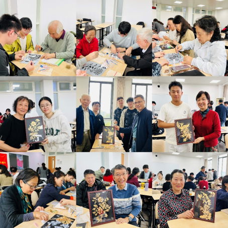 老教师和同学们分组共同制作非遗传统金箔画并品尝菊花酒。