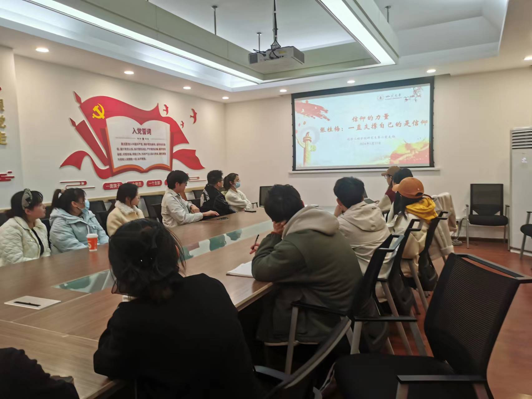 “一直支撑我的是信念,是对党的信仰。”这句话是我国“七一勋章”获得者、中共二十大代表、全国妇联副主席(兼)、丽江华坪女子高级中学校长张桂梅老师所说,她的目标不仅是帮助女孩们走出大山,更是培养她们成为社会主义接班人,忠于党和人民,去做更大的事情。为筑牢研究生第六支部党员同志的理想信念根基,2023年1月10日晚上7点,新葡亰8883ent研究生第六党支部在望江校区化工楼227会议室开展了“信仰的力量”主题党会。会议由党支部书记李艳静同志主持,王娜同志作汇报。